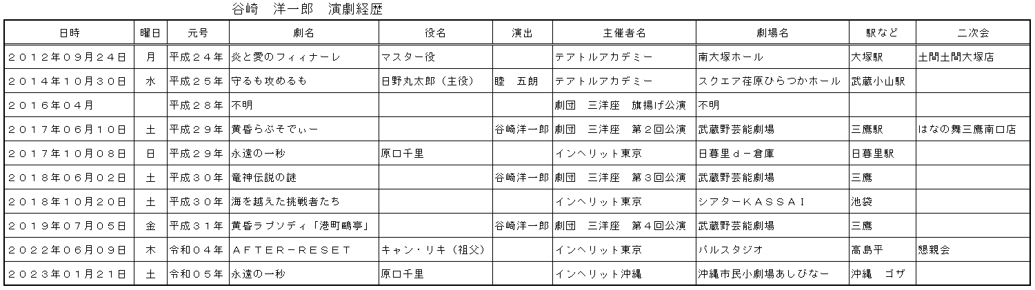 谷崎君は2010年くらいから演劇に注力し、別表にその経歴をまとめたが、三洋座という劇団を仲間と立ち上げ、劇団員をまとめ4回の自主公演や運営は立派であったと思うし、またその都度OB/OG募集や懇親会の段取りまで小堤代表世話人には大変なご助力をしていただきました。