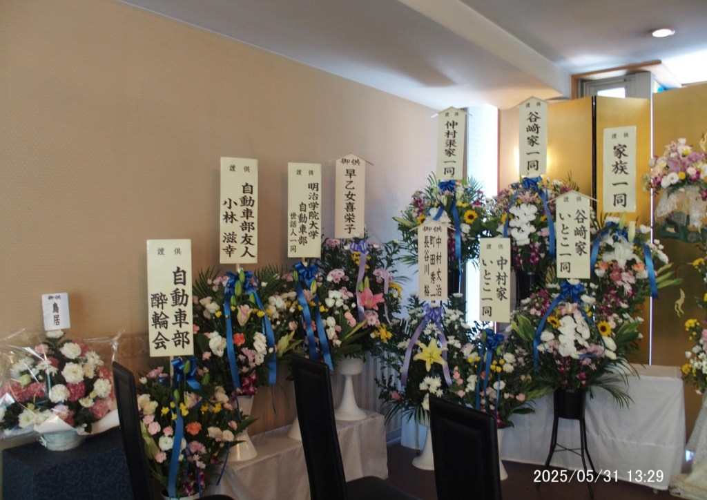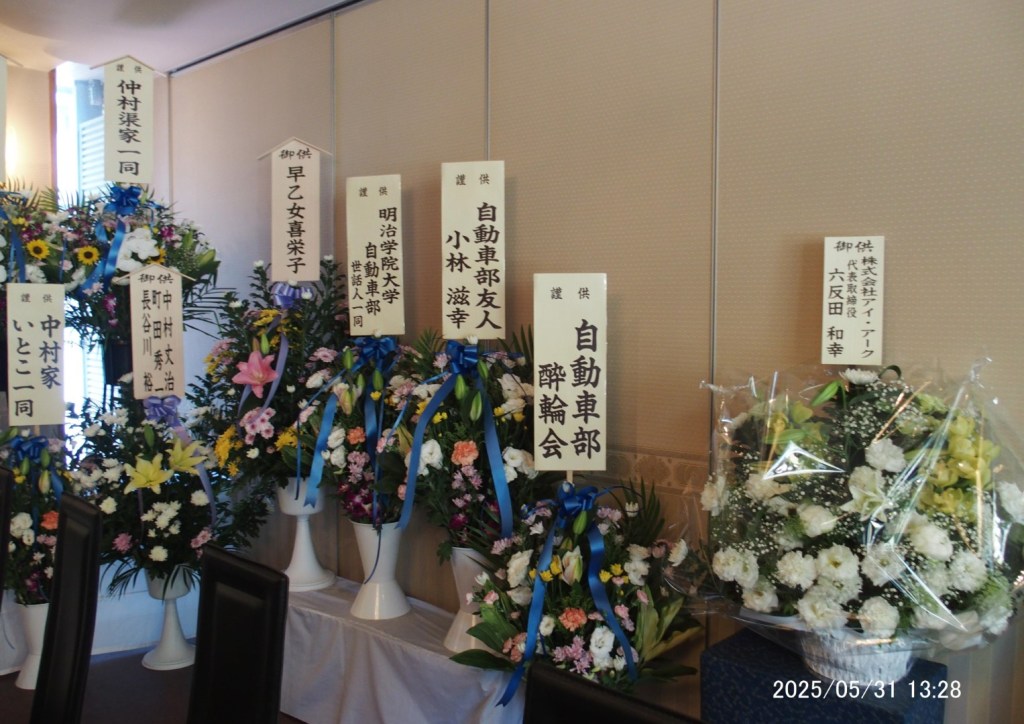 昔仕事で住んでいた沖縄に改めて渋谷池尻から5年前に移住し、以前から知っていた20歳近く年下で初婚の奥さんと2年前再婚しました。最近は地区の西原公民館カフェの祭イベントなどの中心人物となりNHKでも紹介されました。その活動と共に明学自動車部OBOG会の新代表世話人となり、Auto Clubを軌道に乗せることに力を入れることが今は一番の生きがいにしているとの奥さんの話がありました。その戦力を突然「食道がん」で失い脱力してしまいそうですが、ここ一番故人の無念の思いをくみ取りみんなで引き継いでいきましょう。