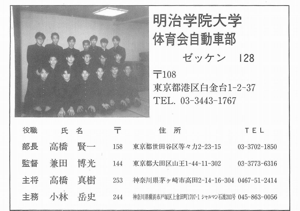 加盟校名簿(関東支部36校・中部支部15校・関西支部25校・中四国支部17校・九州支部19校・合計112校)に明治学院大学体育会自動車部も当然ながら紹介されております。