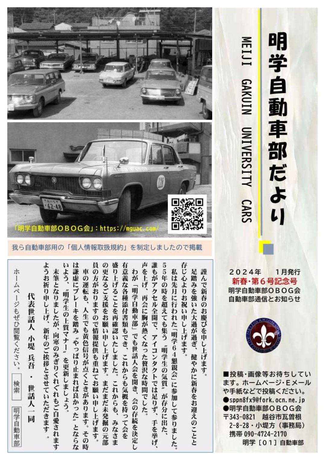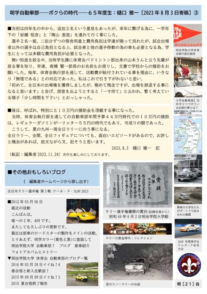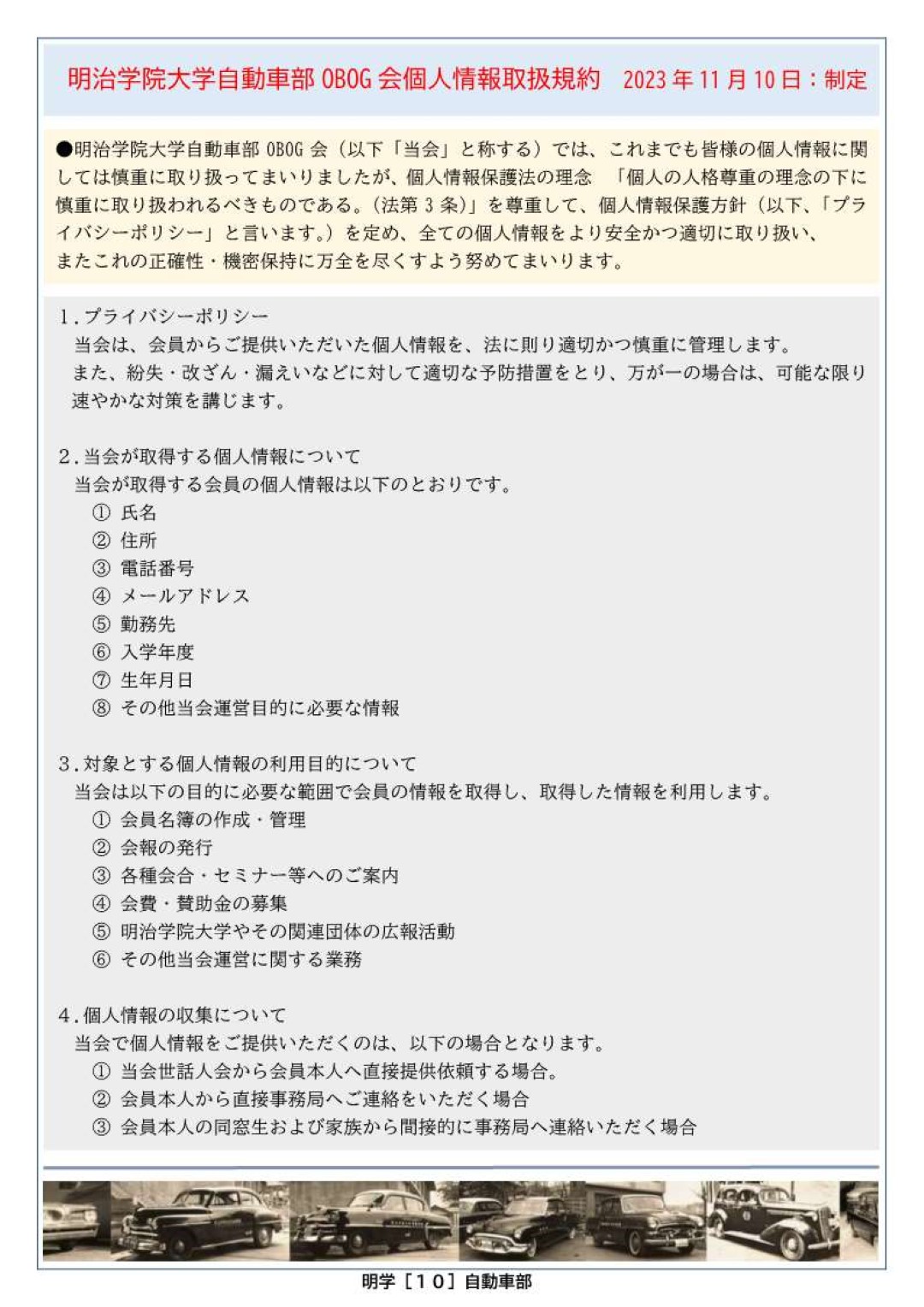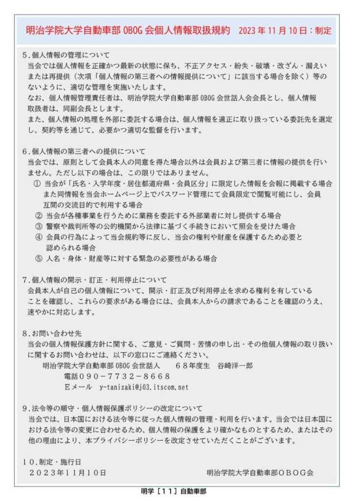 明治学院大学体育会自動車部OBOGが集う団体です。1952年度創部の伝統ある部でしたが、2020年3月に廃部となり68年の歴史に幕を閉じました。